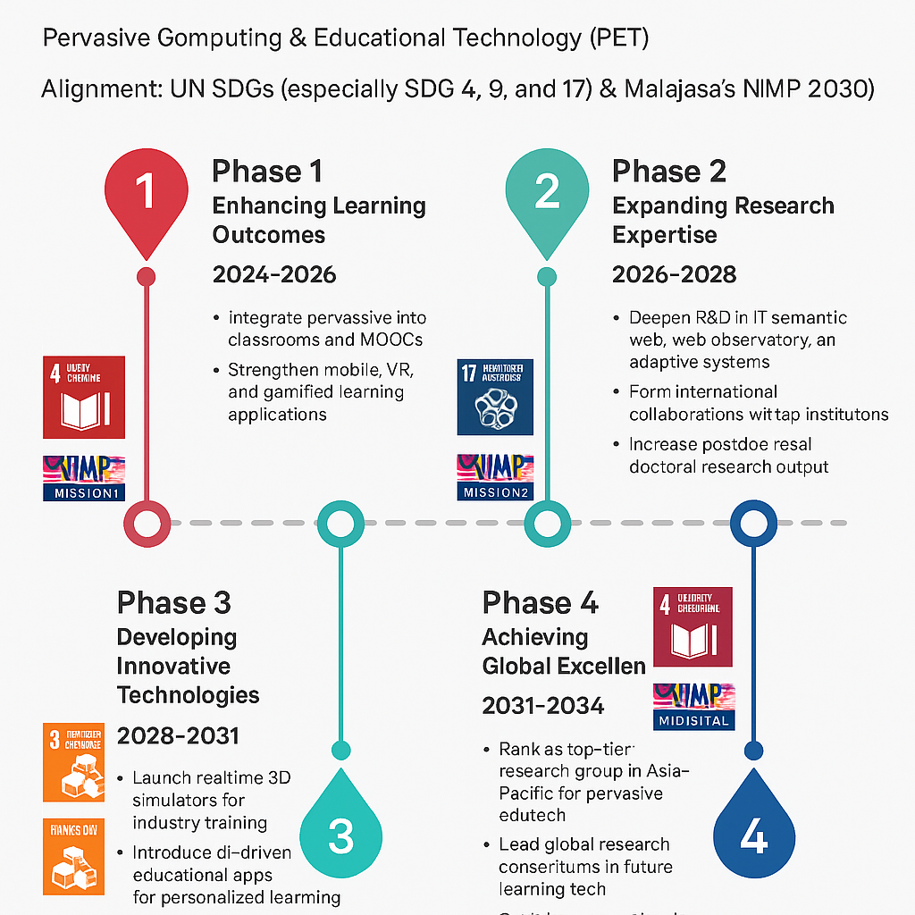 PET stands for Pervasive Computing & Educational Technology. PET focuses on how to effectively integrate pervasive computing technologies into educational settings to enhance teaching and learning outcomes. PET also aims to advance the understanding and application of pervasive computing technologies in educational contexts, with a focus on improving learning outcomes and experiences.