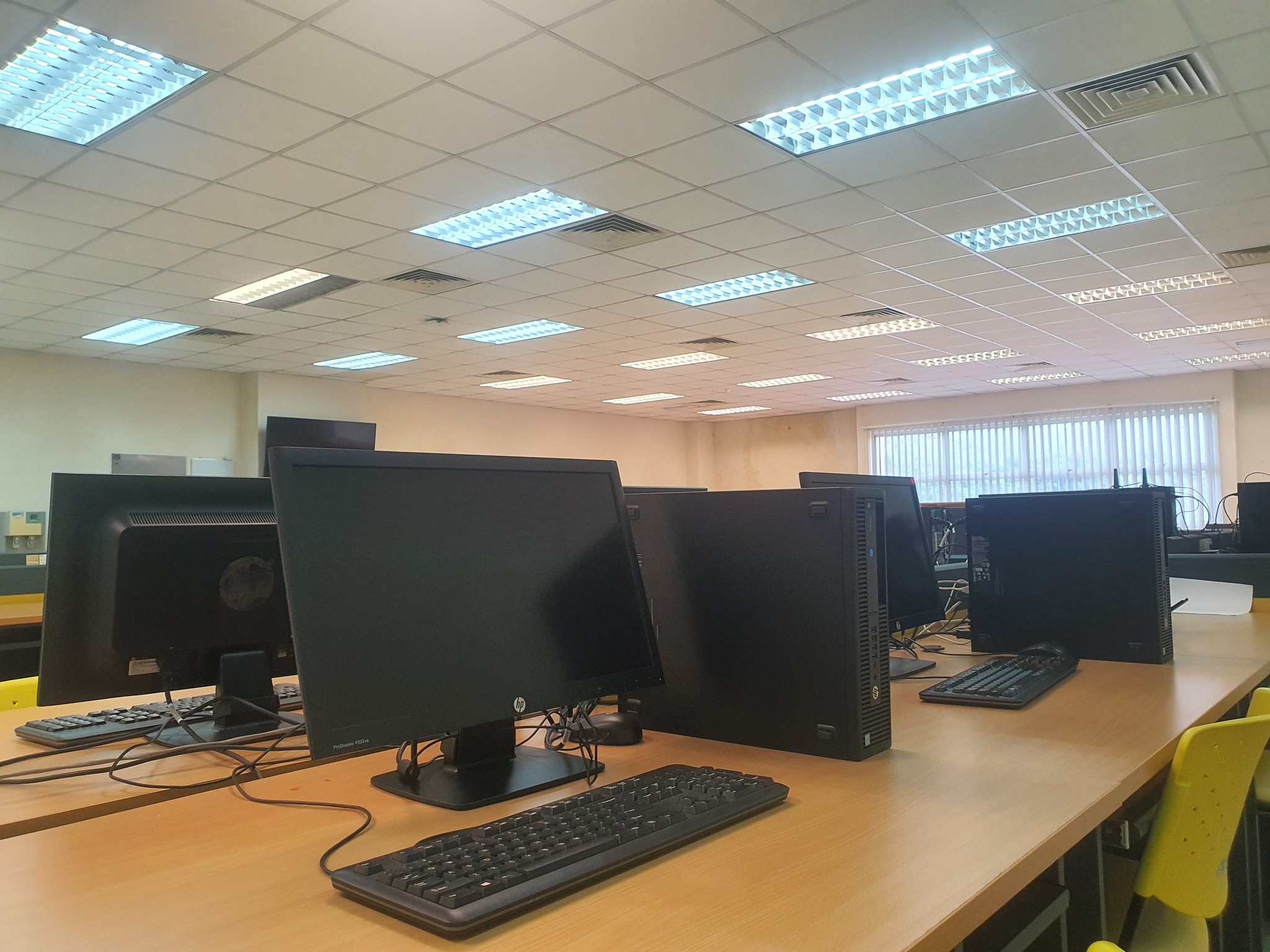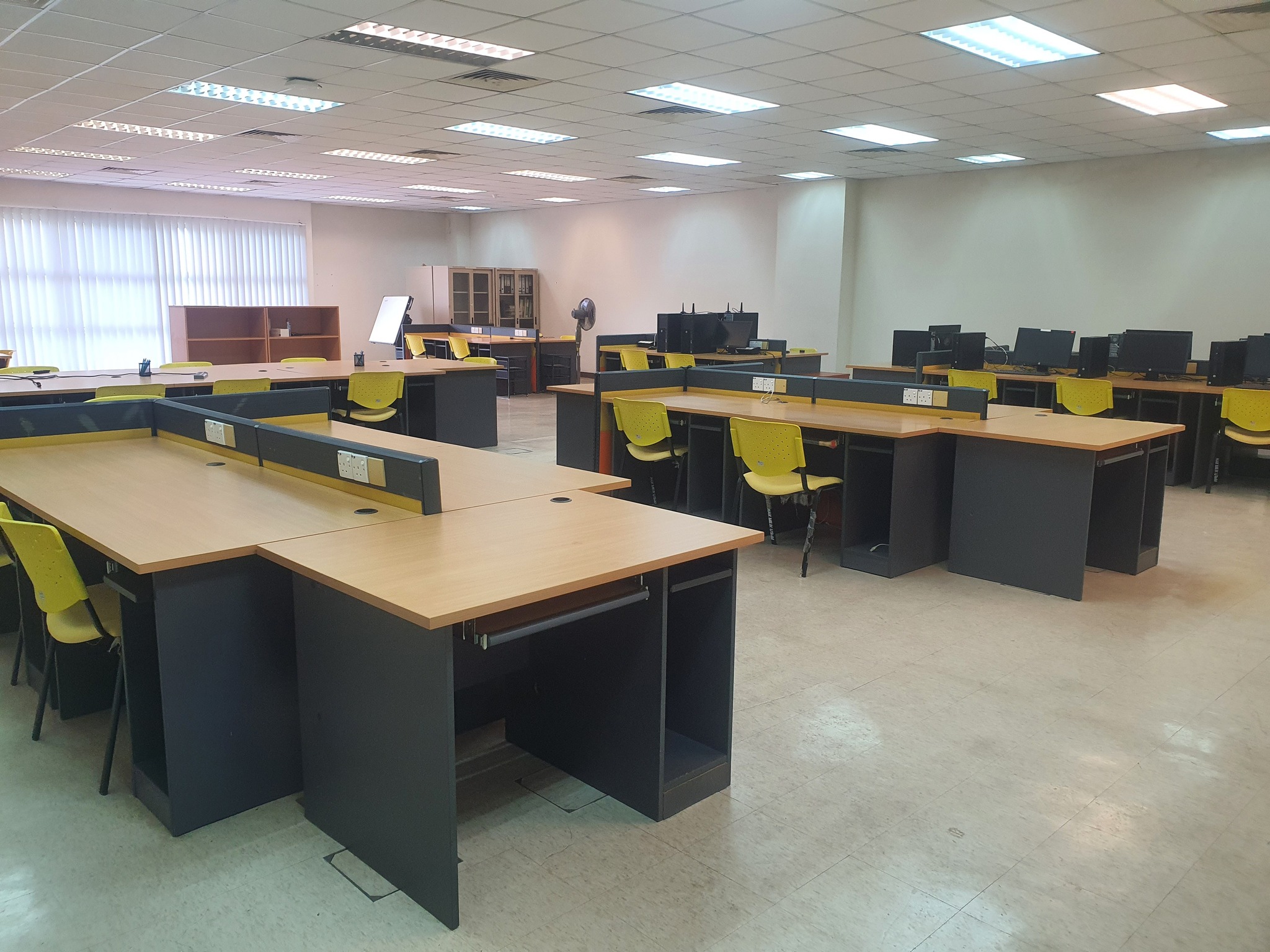 This working area is equipped with desktop computers and spacious desks, providing a conducive environment for students, researchers, and research group members to carry out computing tasks, experiments, and collaborative research activities.