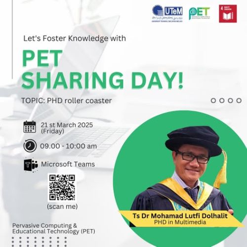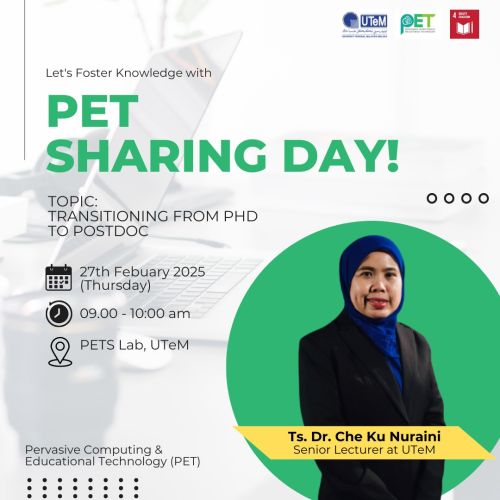 Join us for an insightful session of PET Sharing Day, organized by the Pervasive Computing & Educational Technology (PET) research group, UTeM. This knowledge-sharing event aims to foster academic dialogue and motivation among researchers and postgraduate students.