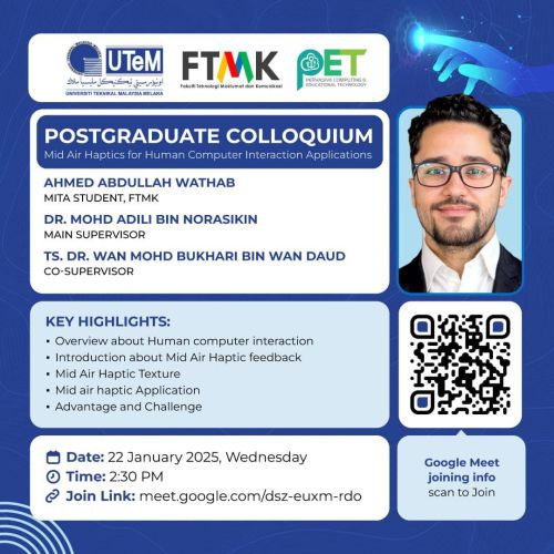 The Faculty of Information and Communication Technology (FTMK), in collaboration with the Pervasive Computing & Educational Technology (PET) research group, invites you to a postgraduate colloquium featuring an exciting exploration into mid-air haptic technology in the field of Human-Computer Interaction (HCI).