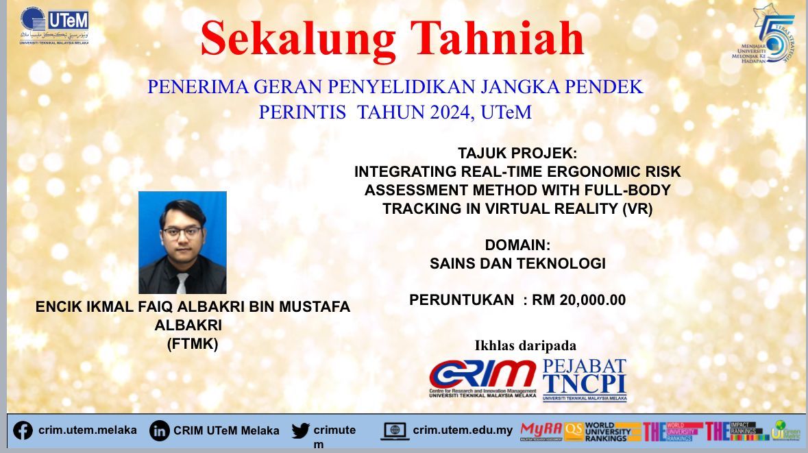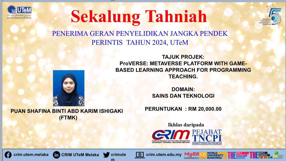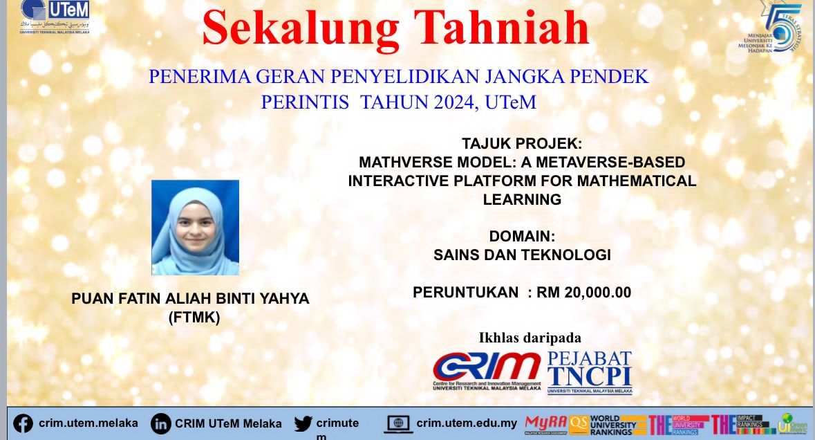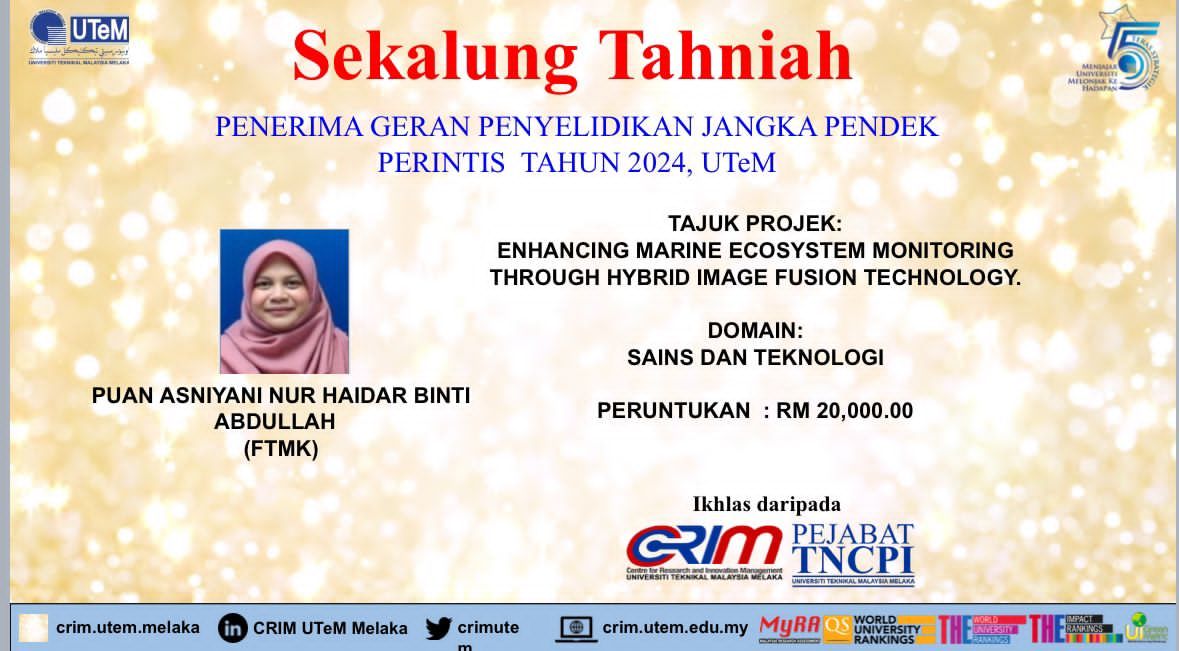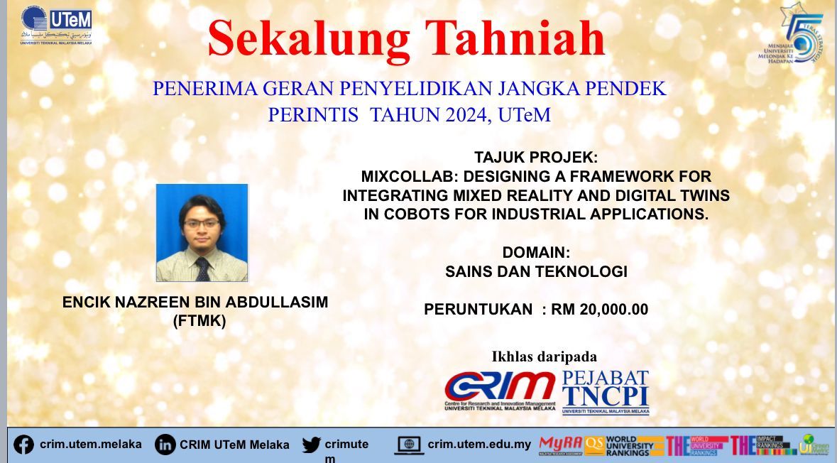 A heartfelt congratulations to our PET Research Group members for being awarded the Geran Penyelidikan Jangka Pendek (PJP) Perintis 2024, UTeM.